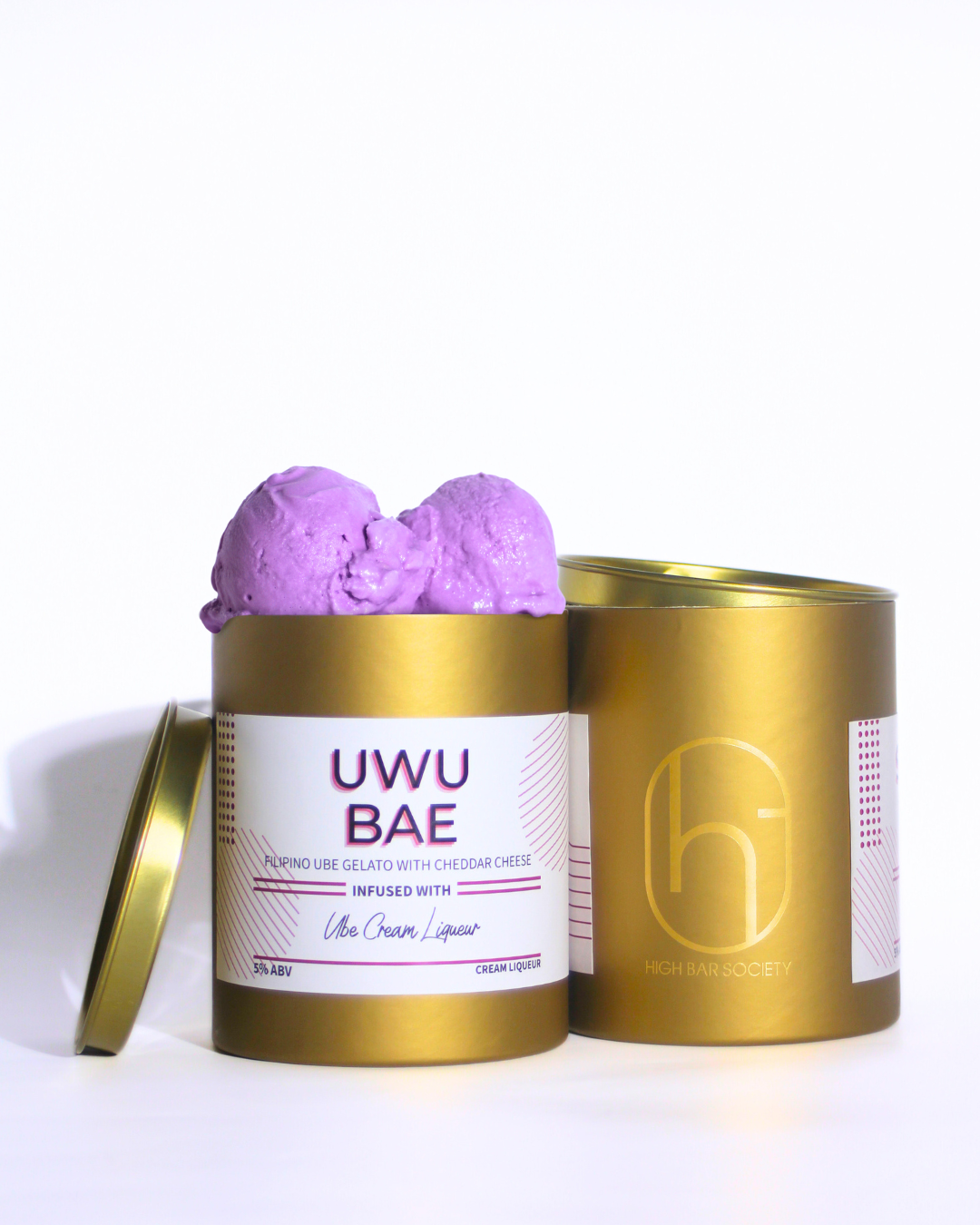 UWU Bae is High Bar Society's internet culture-inspired gelato featuring double ube (Filipino purple yam) - both in the gelato base and through Ube Cream Liqueur - at 5% ABV. This Singapore-exclusive creation is the only alcoholic ube gelato in the city, combining Filipino culinary tradition with cute culture and boozy innovation. notices your purple gelato UWU what's this? Only the most adorable way to get tipsy!